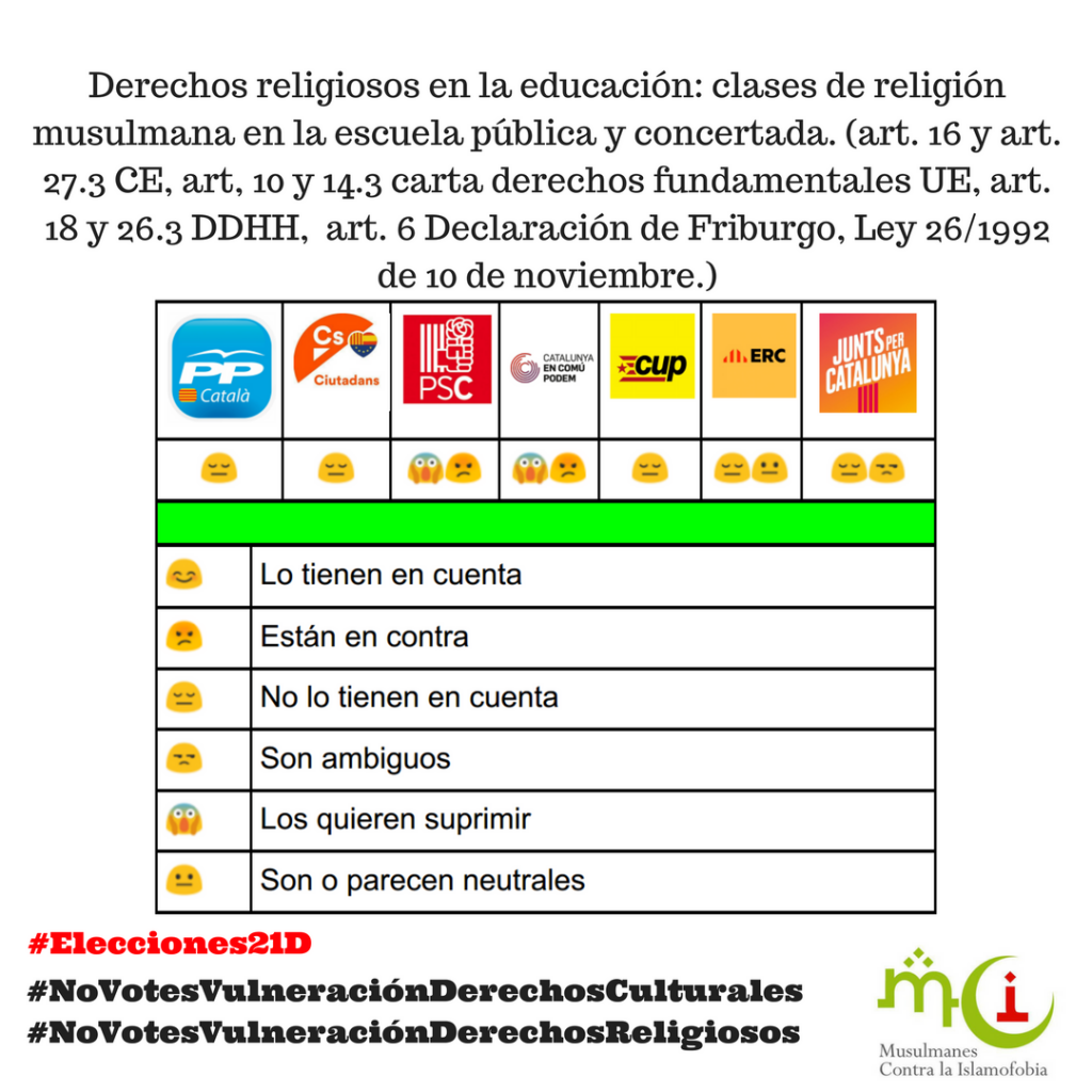 En relación a las elecciones autonómicas del 21 de diciembre de 2017, Musulmanes contra la Islamofobia, quiere dar una orientación de voto en función del contenido #islamófobo de los programas electorales, el cual será valorado en función del respeto a los derechos culturales tal y como se definen en la declaración de Friburgo (07/05/2007).