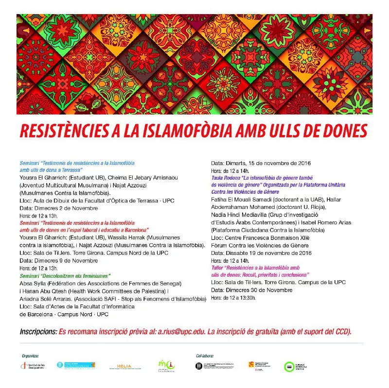Musulmans contra la Islamofobia participarà com a coorganitzador en un cicle de seminaris titulat «Resistències a la Islamofòbia amb ulls de dones» que es celebraran del 2 al 30 de Novembre a la UPC organitzades per l’Institut de les Desigualtats, Càtedra UNESCO Salut Visual (UPC), l’Associació Hèlia i Musulmanes contra la islamofòbia.